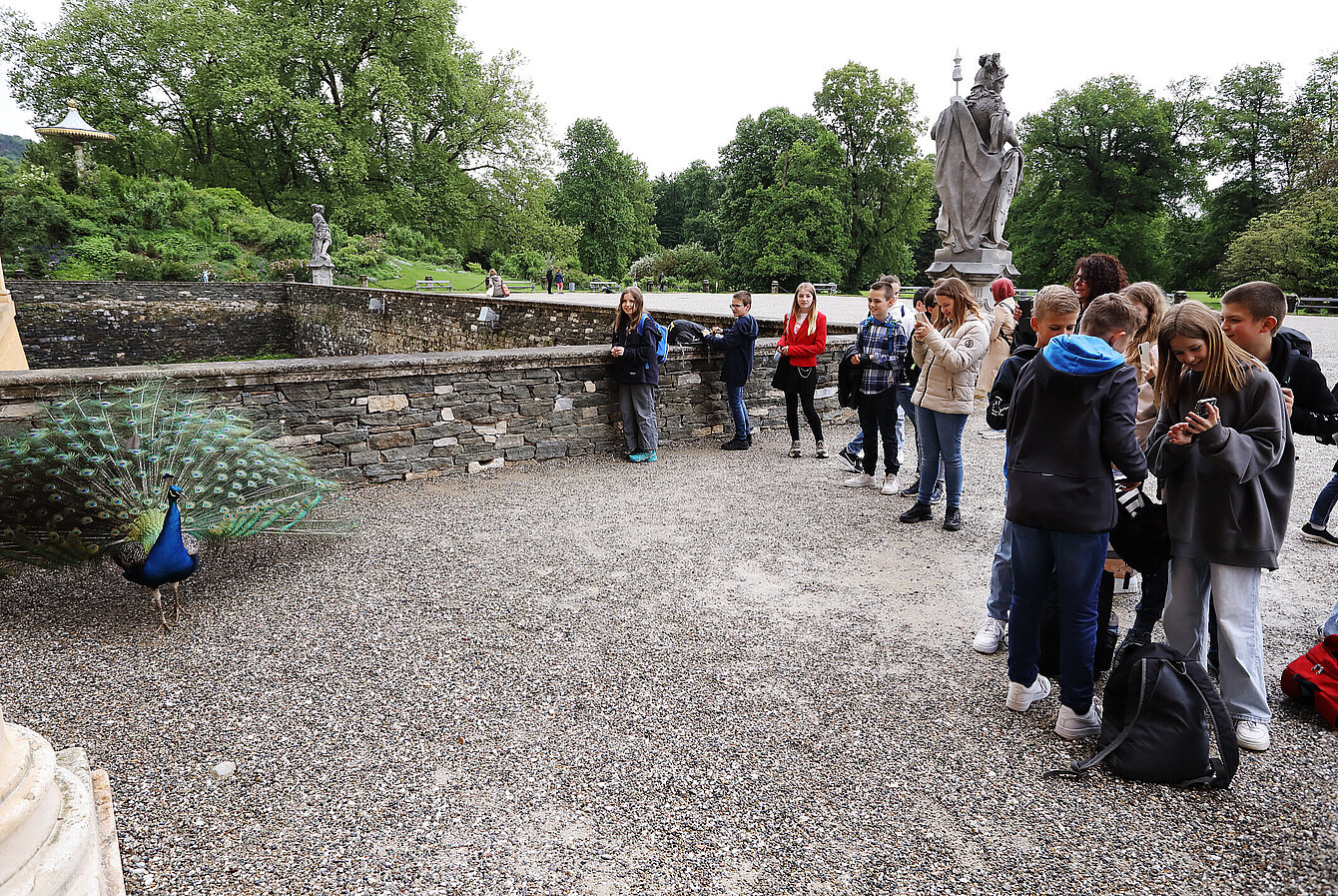 Bei einem Rundgang durch den Schlosspark auf den Spuren dieser Tiere werden einige Fragen beantwortet: Woher kommen Pfaue ursprünglich? Was fressen sie? Wie alt werden sie? Wer kümmert sich hier im Park um diese Tiere? Warum können sie ein Rad schlagen?