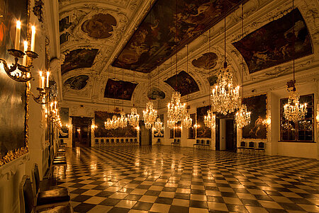 Die Prunkräume wurden seit über 250 Jahren fast nicht verändert und nie mit elektrischem Licht ausgestattet. Die Kurzführungen bei Kerzenlicht ermöglichen eine außergewöhnliche Zeitreise in die Welt des Barock! Zeitkarten sichern.