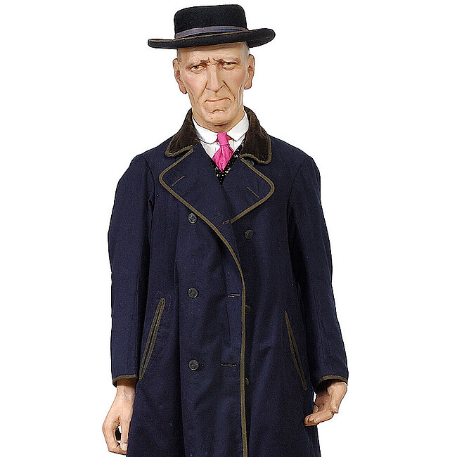 Der Bauernknecht aus der Stainzer Gegend fällt wegen seines zuckerhutförmigen Hutes besonders auf. Der „Bullkoglerhut“, üblicherweise aus Lodenfilz, war in dieser auffälligen Form in Teilen der Weststeiermark bis zur Mitte des 19. Jahrhunderts verbreitet. Mitunter waren diese Hüte mit Schnüren bestückt – in Zahl und Farbe sollen sie die soziale Stellung und die Besitzverhältnisse der Person angezeigt haben. Die Schnüre für den Hut in der Vitrine wurden in den 1980er-Jahren von einer Museumsmitarbeiterin ergänzt, die auch die Stutzen strickte. Die Joppe kam aus Schladming, das Tuch gehörte einer Bauernfamilie aus Passail, die Pfeife trägt einen Herstellerhinweis aus der Südsteiermark: „M. Knecht, Sausaler Handarbeit".