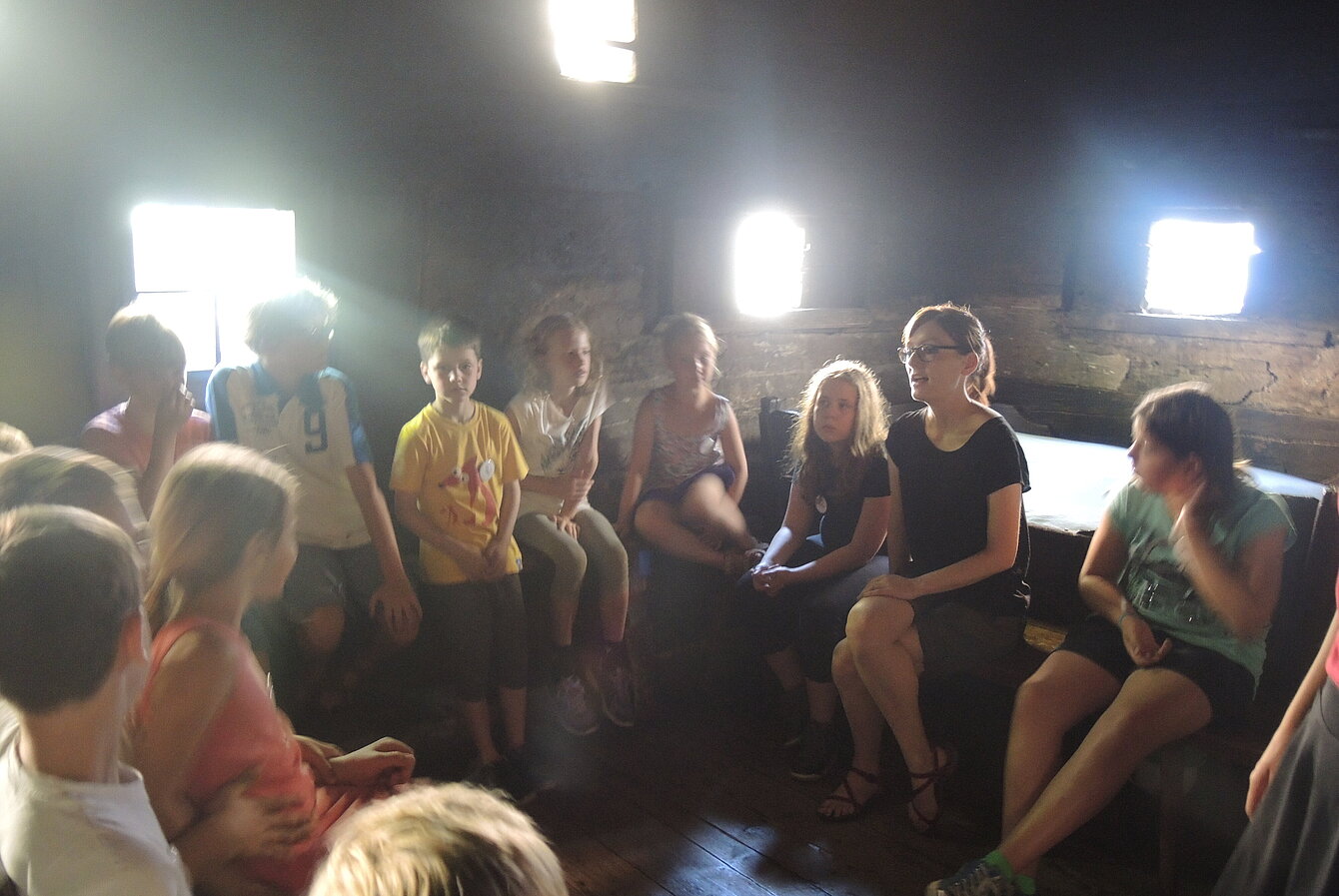 In unserem Museum gibt es einen Raum, in dem konnte man alles tun, was früher zum Wohnen gehörte, vom Schlafen bis zum Verstecken. Erst schauen wir uns an, wie es dort aussah und was dir dort alles gefällt. Und dann probieren wir einige Dinge aus, die es früher dort vielleicht gab, heut aber fast nicht mehr.