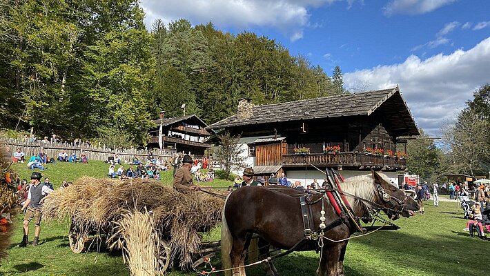 Programm (Auswahl): Umzug der Erntekrone, Erntedankgottesdienst, Futterschneiden (jede volle Stunde), Umsägen und Holzstreifen mit dem Pferd, Mistaufseilen, Traktorparade, Frühschoppen, Traktorpräsentation, digitale Vermittlung und EU-Projekt-Installation, Getreidegarben transportieren, Feldarbeit mit dem Pferd, Schnalzen, Dreschen, Mähen mit dem Pferd, Graswenden mit dem Gabelwender